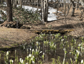 ・「みずばしょう園」のミズバショウが見頃です。学習館から歩いてすぐ(徒歩2分)。県民の森の春の風物詩をお楽しみください。