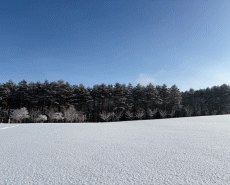 【みんなの広場】伐採されたシラカンバ並木の替わりにアカマツ林が遠望できます。